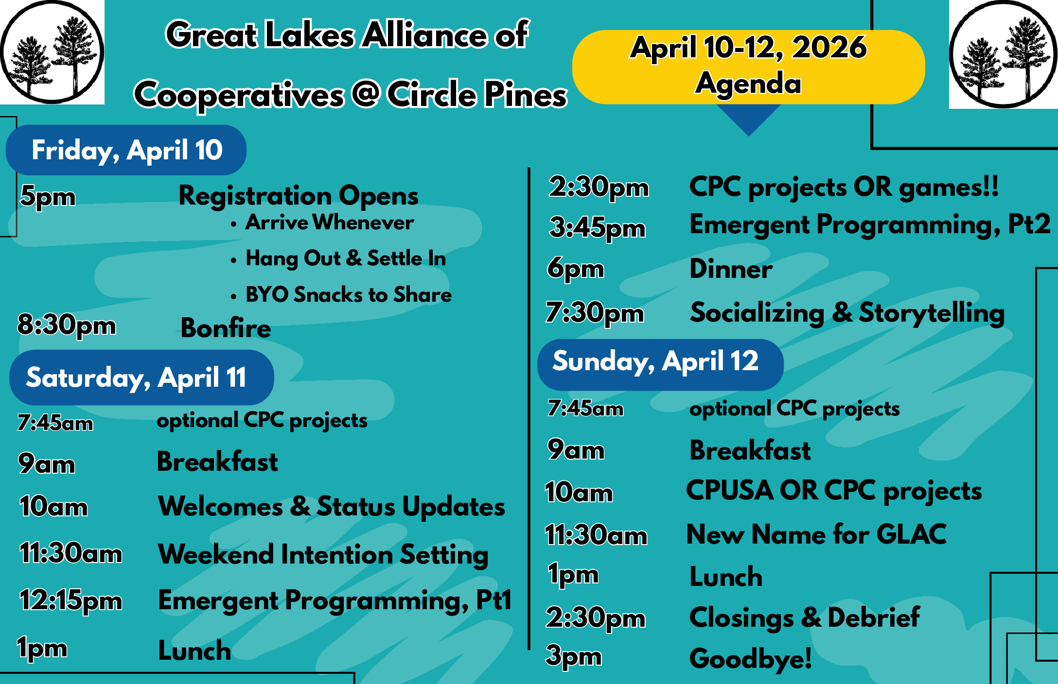 Our Great Lakes Alliance of Cooperatives Spring Retreat will be April 10-12 at Circle Pines Center. Save the Date and make a plan to be there with others from your co-op!